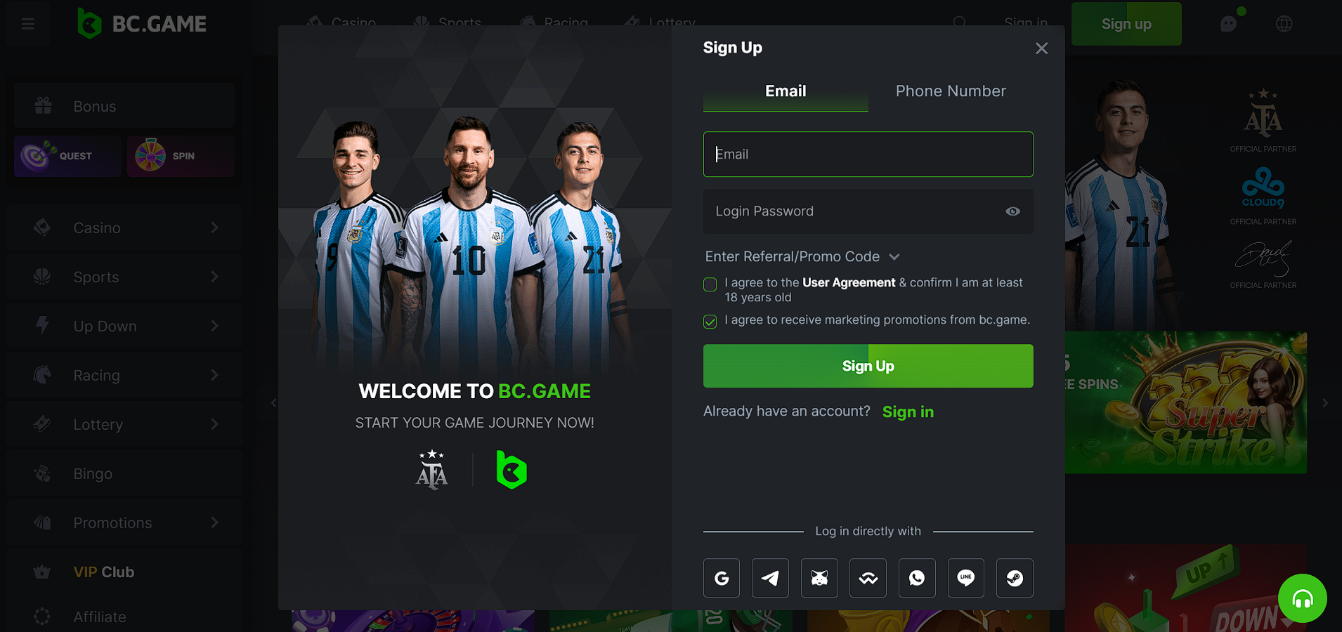 Artık kayıtlı olduğunuza göre BC.Game Casino girişi Google, Facebook, Telegram ve birkaç başka yolla yapılabilir veya doğrudan siteye e-postanızı ve şifrenizi girebilirsiniz.